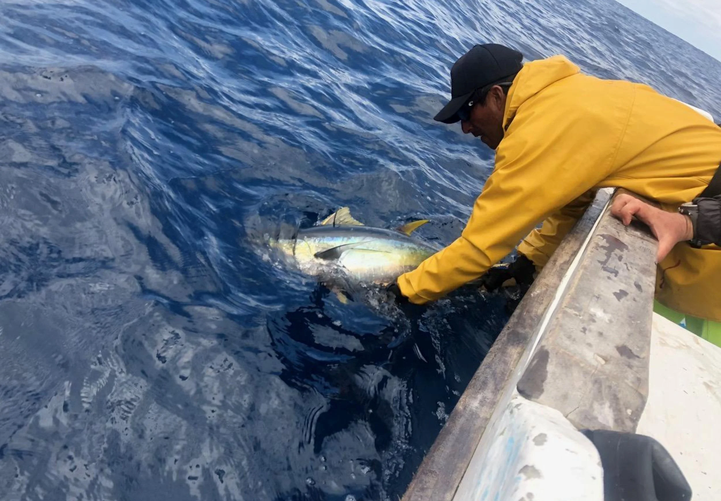 Researchers release a Yellowfin Tuna in the Galapagos Marine Reserve. Photo: Galapagos Science Centre